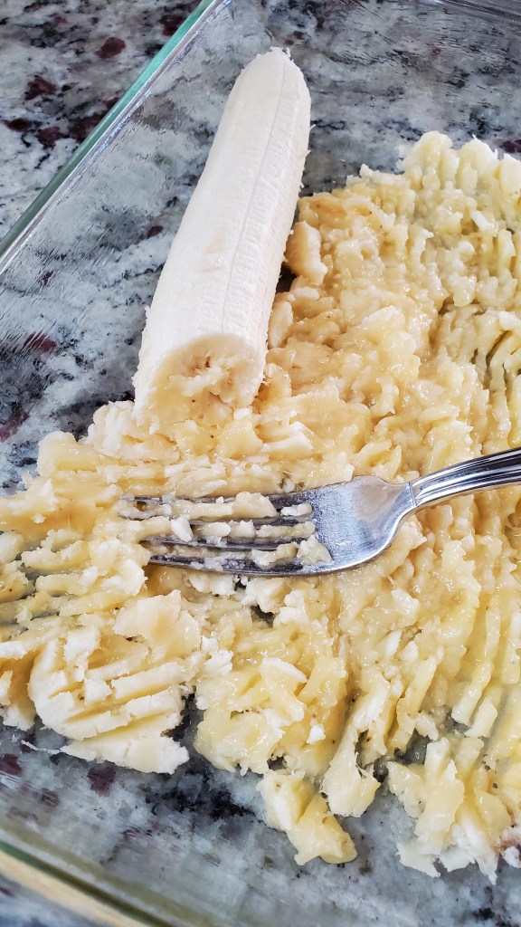 Use a fork to mash the bananas in the baking dish. Add the oats, followed by the chia seeds.