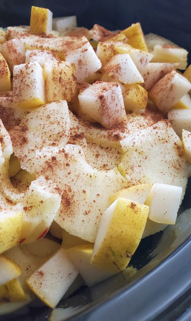 Pear applesauce is just as easy to make as basic applesauce. You can make it on the stove top, but I prefer using a slow cooker. Not only does it come together easily, but it fills your home with an incredible smell! Just chop the fruit and toss everything into your slow cooker and let it do all the work!