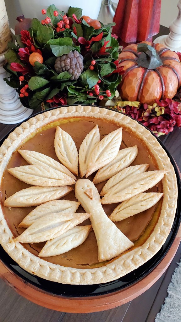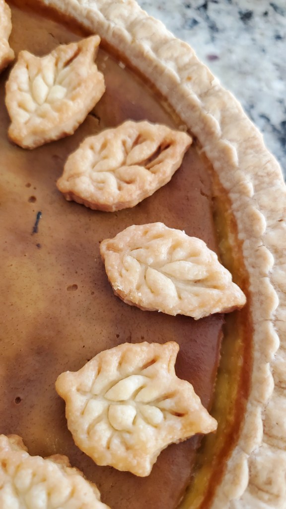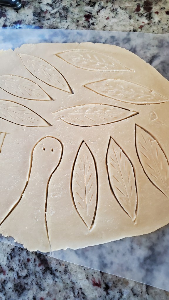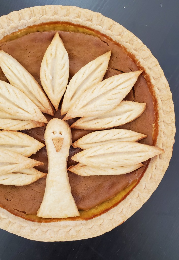 Bake your pieces according to how you would otherwise blind-bake your dough (mine baked for 12 minutes at 425F). Once they’re golden brown and baked through, allow them to cool for 5 minutes to firm up. Once they’re cool, lay out your turkey design on top of your cooled pie!