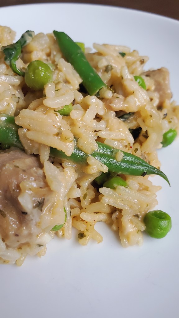 Stir in the green beans and peas and return the lid to the top. Let it cook another 5-7 minutes, or until most of the liquid has been absorbed and the veggies are cooked.