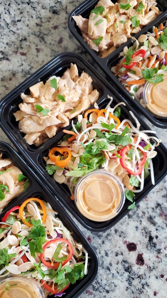 NOTE: This recipe is wildly customizable! Feel free to use the list of salad fixings as a guide to mix and match to your own tastes. You can also tweak the dressing, as well. I added a bit more peanut butter and Sriracha sauce than the original recipe. You can even customize the protein, as I substituted chicken breast for the shrimp that Flay originally called for.