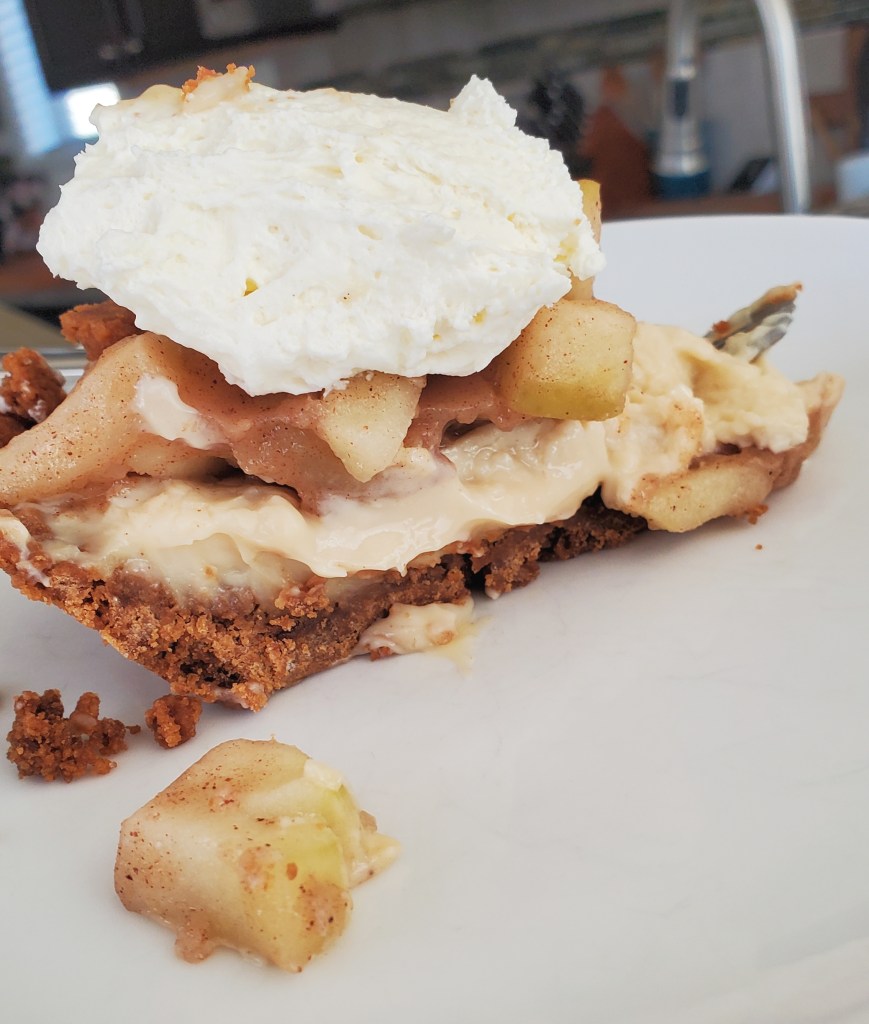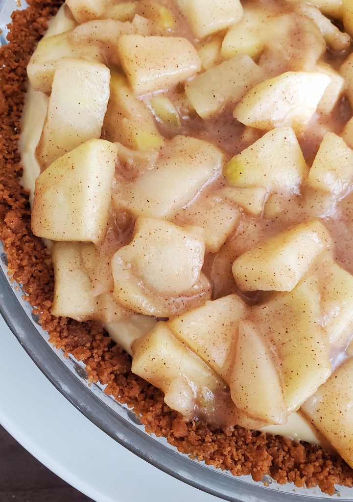 To assemble the pie, spread the pastry cream evenly into the cooled cookie crust, top with the apple mixture, and serve!