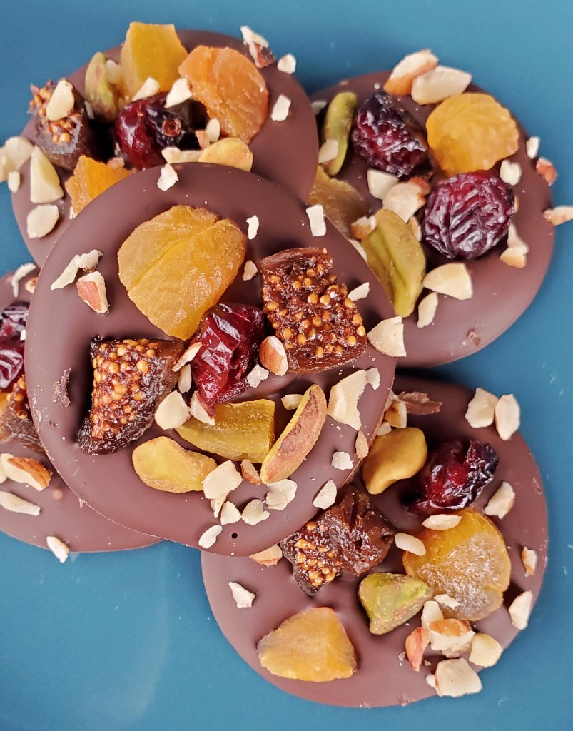 Nowadays, Mendiants are mostly found in fine chocolateries and candy shops in Paris and throughout France during the Christmas season, made with high quality chocolate and sold for exorbitant prices. The variety of toppings has increased, as well. It’s not atypical to see wide selection of toppings such as coffee beans, dried berries, candied citrus peel, cocoa nibs, pumpkin seeds, coconut…the options are only limited by creativity!