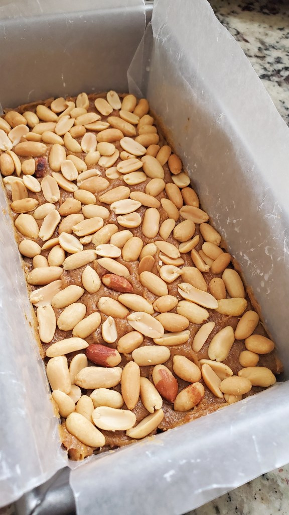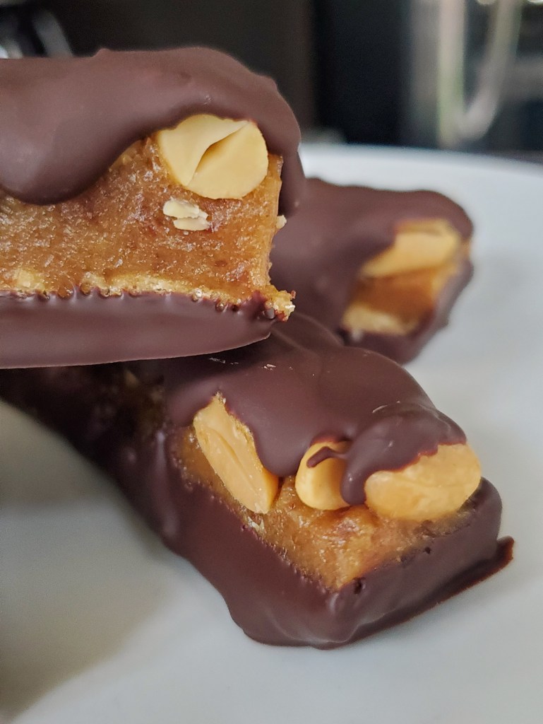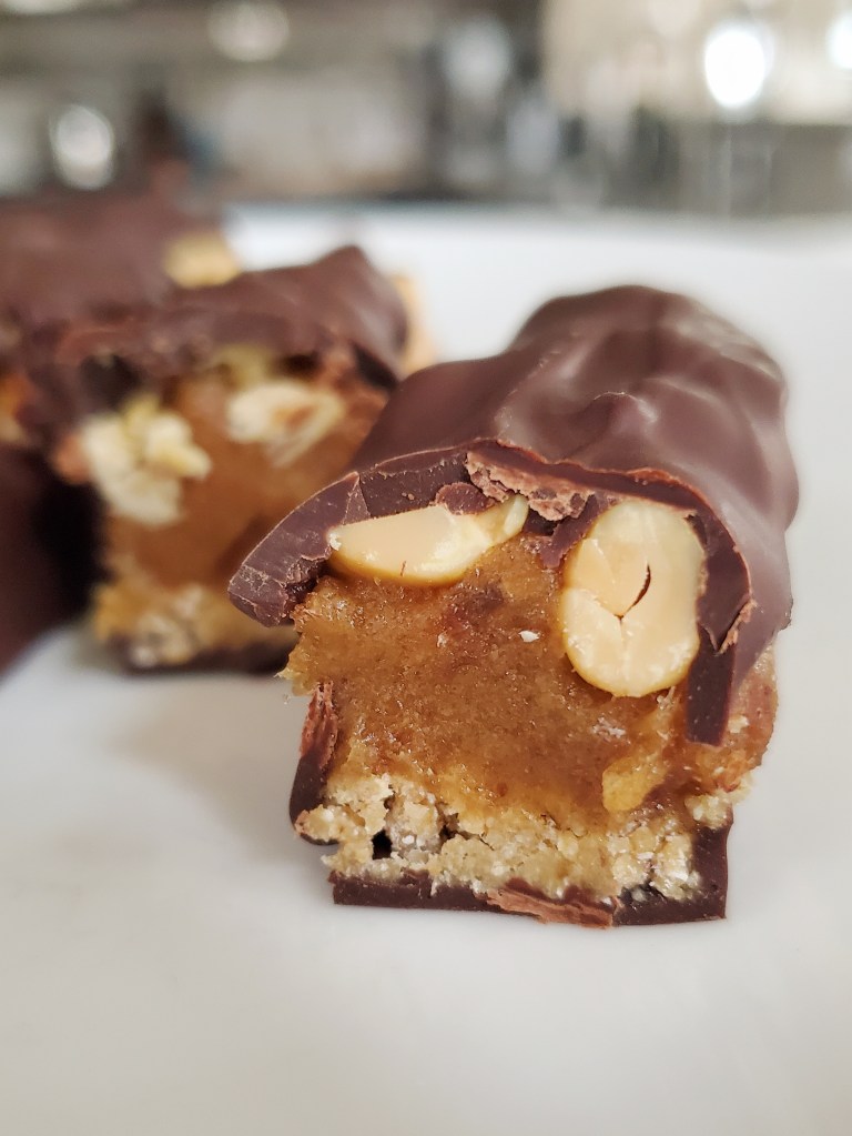 To assemble, line a loaf pan with parchment paper so you can easily lift the bar filling out once it is prepared. Firmly and evenly press the nougat “dough” into the bottom of the prepared pan. Use a spatula to spread the remaining caramel evenly over the nougat, then sprinkle the peanuts on top. Use your fingers to press the peanuts into the caramel layer, so they stick. Place the whole thing in the freezer for 90 minutes to 2 hours, or until firm.