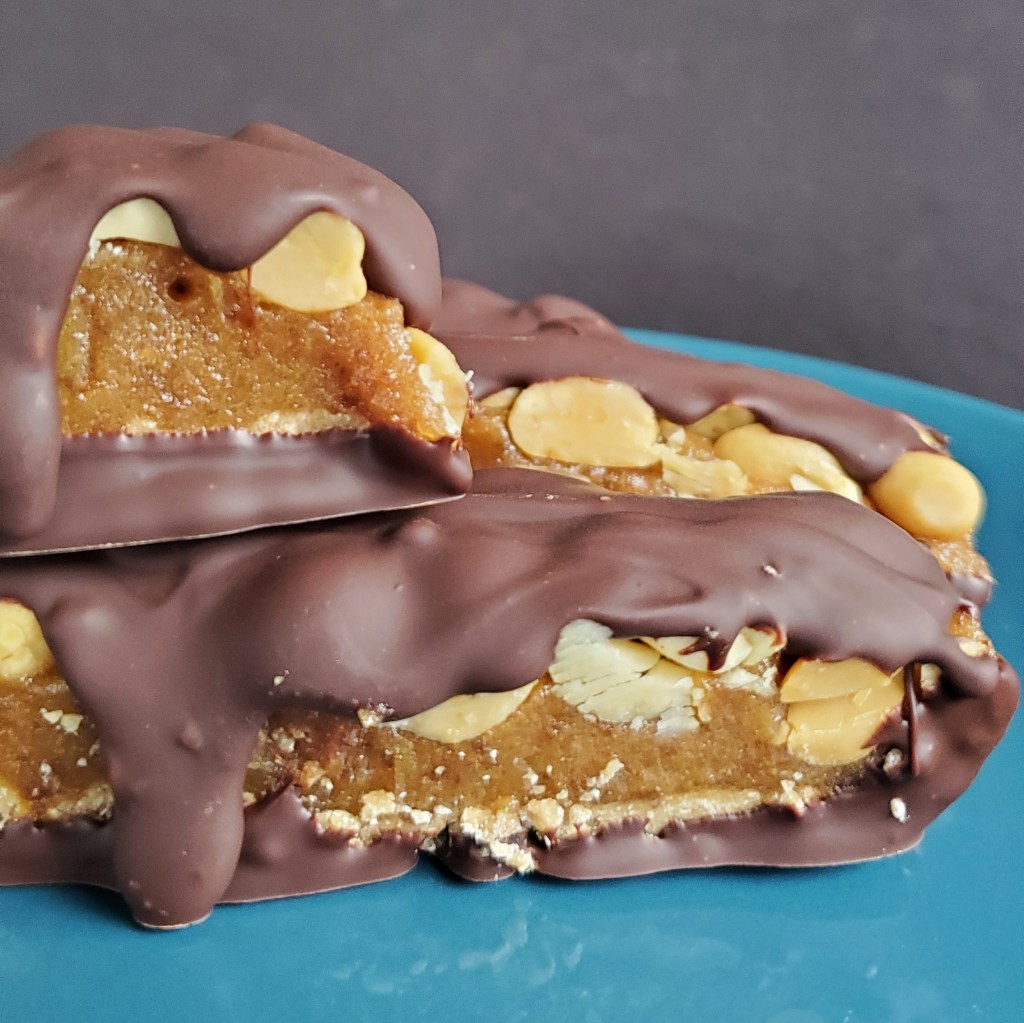 The one problem I had when making the original recipe was running out of chocolate during the enrobing, hence why mine look a little naked and spotty. (Confession: I probably ran out prematurely because I’m not yet very good at chocolate work and had covered everything – including myself – in chocolate, except the bars. Oh well!) While mine still taste incredible, I’ve added a couple more ounces of chocolate to this recipe just in case the same thing happens to you. I mean, is more chocolate really a problem?