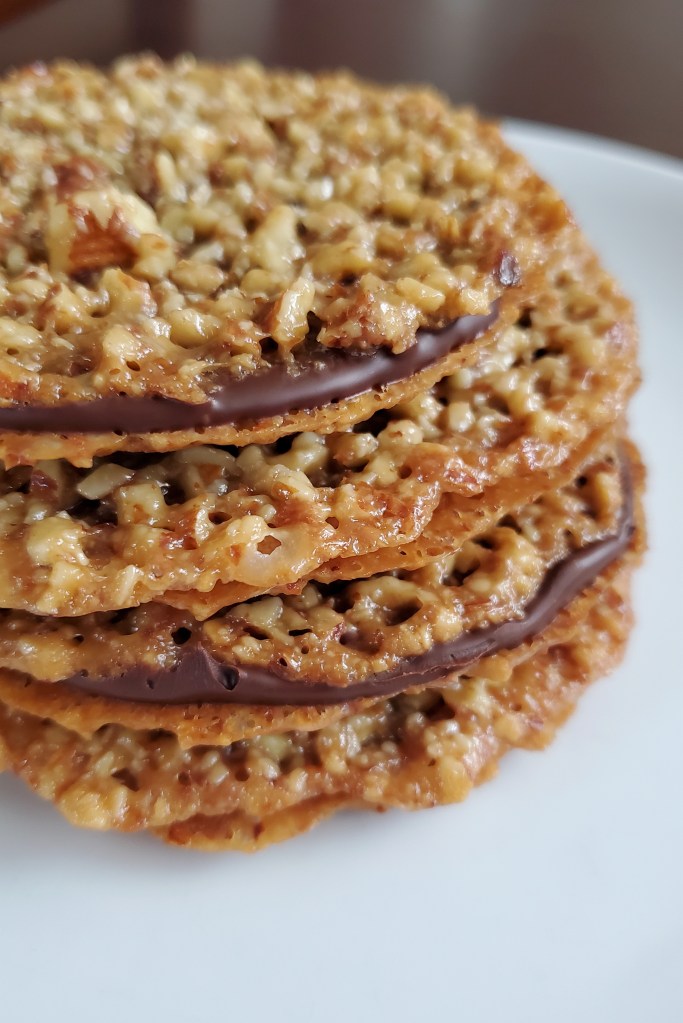 However, there are some aspects of Florentines that are fussy. The batter is simultaneously buttery and sticky. They spread a lot in the oven, so you can only bake a small number at a time and need to rotate baking sheets for awhile to get all the cookies baked properly. This also isn’t a recipe in which you can rush the cooling process; they need to be completely cool before assembly. And I’d recommend a fair amount of parchment or wax paper when assembling them, as they have lots of tiny holes (why they’ve been nicknamed Lace Cookies!), so it’s common for chocolate to sneak out and get everywhere.