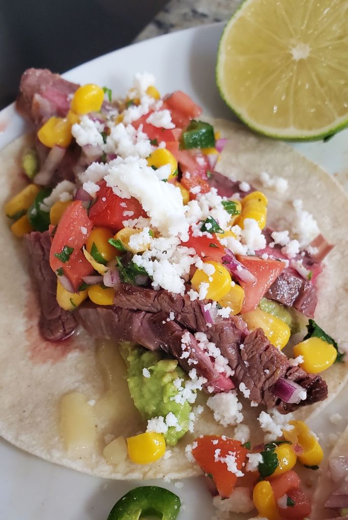 The trick is to heat the corn tortillas with some cheese sprinkled on top. The tortilla gets warm and pliable while the cheese gets soft and melty. Next, spread smashed fresh avocado, then grilled steak in all its tasty juices (these things are loaded with protein!) Next, spoon on an addictive, easy-to-make tomato corn salsa with zingy lime and a little kick. Finally, sprinkle on some queso fresco and enjoy!